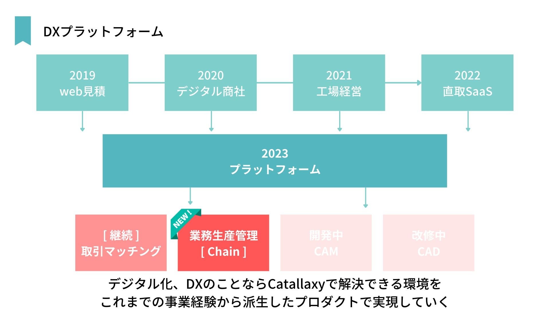 Catallaxyは金属加工業界で「未来の製造業をつくる」をvisionに掲げるテクノロジー企業です。創業以来、受託開発から自社プロダクト開発、デジタル商社経営、工場経営を経て、デジタルプラットフォームとして成長して参りました。成長ステージごとに、クラウド新規取引マッチングサービス、WEBで操作できるCADやデジタルカタログ、商社業務特化の受発注システム、図面の直接書き込めるオンライン図面ツールなど、業務フローや用途に合わせて様々なテクノロジーを提供してきました。
