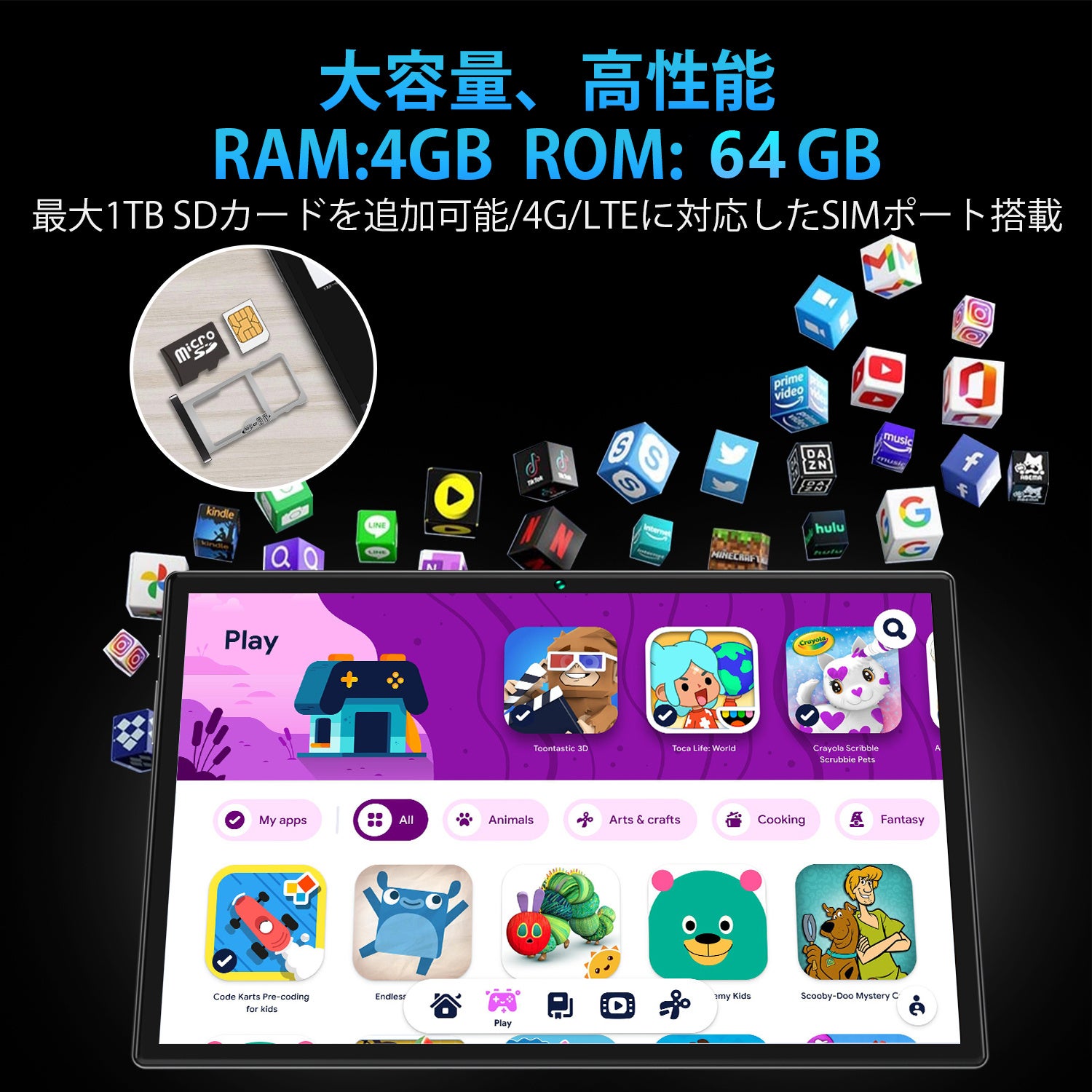 タブレット アンドロイドwifiモデルは大容量64GBのROMで、写真、ビデオ、音楽を保存するのに十分なスペースも備えています。さらに、MicroSDカードを挿入すれば1TB容量を拡張可能です。これにより、高いパフォーマンスと高い電力効率を両立させています。さらに、6600mAhの大容量バッテリーを搭載し、最大6時間の動画を再生することができます。