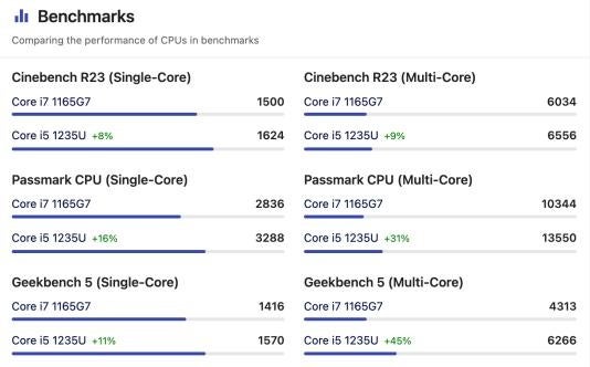 PassMarkとGeekbench5によるベンチマークテストでは、コア数の大幅な増加によってシングルスレッドとマルチスレッドのスコアがともに前世代のUシリーズフラッグシップ1165G7のスコアを超え、とくにマルチスレッドスコアは35%以上上回っていることが分かりました。