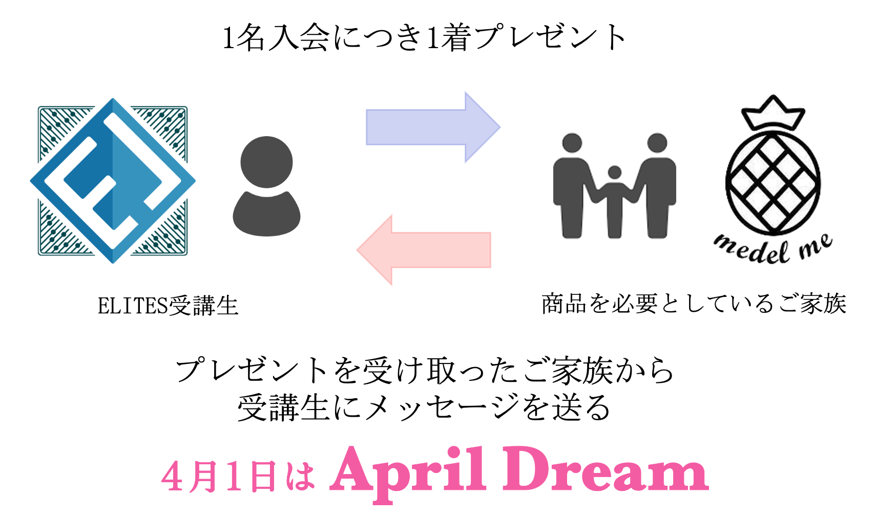 4月からELITESに1名入会する度に、medel meの商品を必要としているご家族に、弊社から1着プレゼントすることになりました。