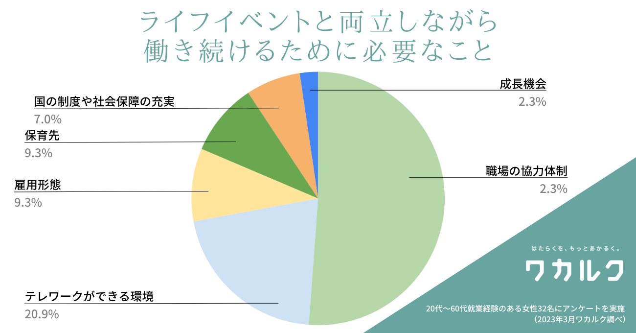 更に、ライフイベントと両立しながら働き続けるためには、「職場の協力体制(51.2%)」「テレワークができる環境(20.9%)」が上位となり、職場環境や働き方の多様性が求められていることがわかりました。