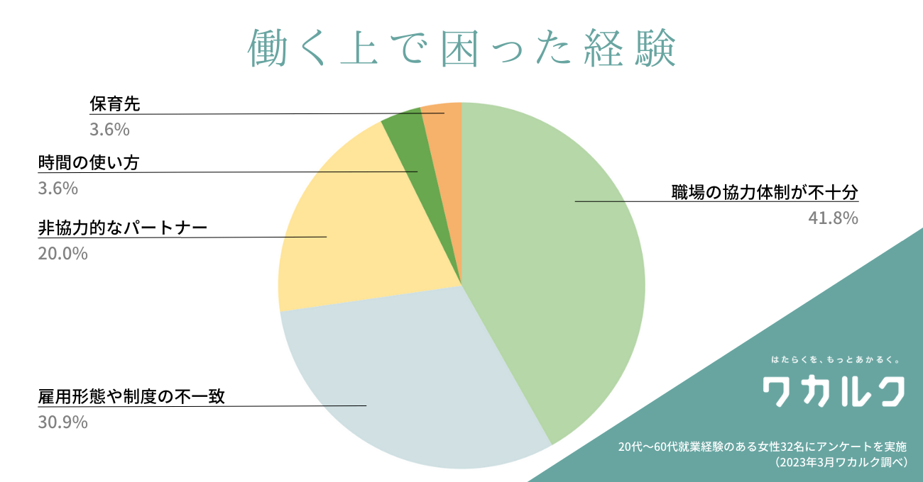 弊社が就業経験のある女性を対象に行った独自調査によると、働く上で困った経験として、41.8%が「職場の協力体制が不十分だったこと」、30.9%が「雇用形態や制度の不一致」、20.0%が「パートナーの協力がなかったこと」をあげており、職場環境に関わる課題が70%を超える回答となりました。
