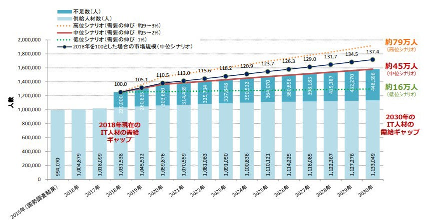 IT系人材需要の伸びによって必要とされる人数に違いが生じるため、高位、中位、低位の3段階のシナリオでシミュレーションが行われています。2030年には最大で79万人の人材が不足すると予測されています。