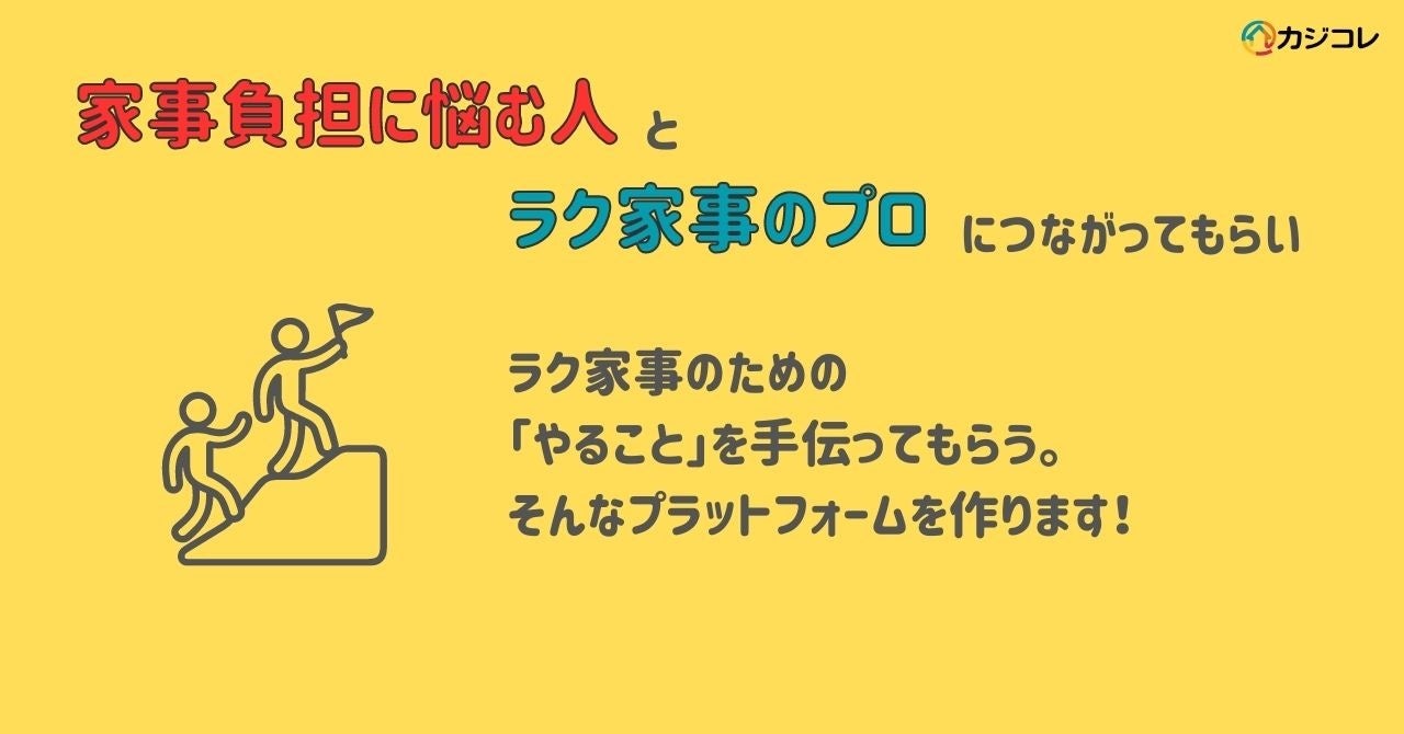 そこで「ラク家事のプロ」と「家事負担に悩む人」をつなぐプラットフォームを作り、「家事がラクな家」をつくるためのお手伝いをしてもらうサービスを提供することにしました。