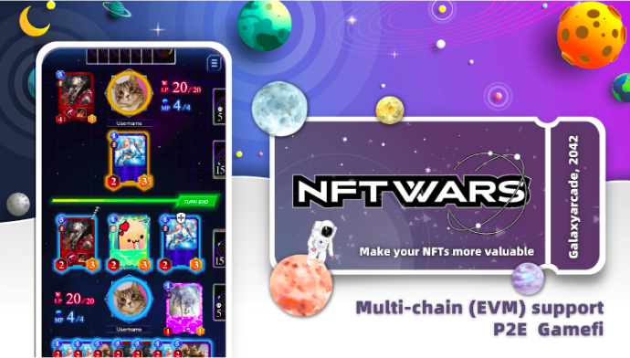 『NFT Wars』は、手軽にNFTプロジェクトにゲームのユーティリティを付与できるサービスです。ユーザーはウォレットで所有するNFTを使用し、様々なNFTプロジェクトのカードゲームで遊ぶ世界の実現を目指します。
