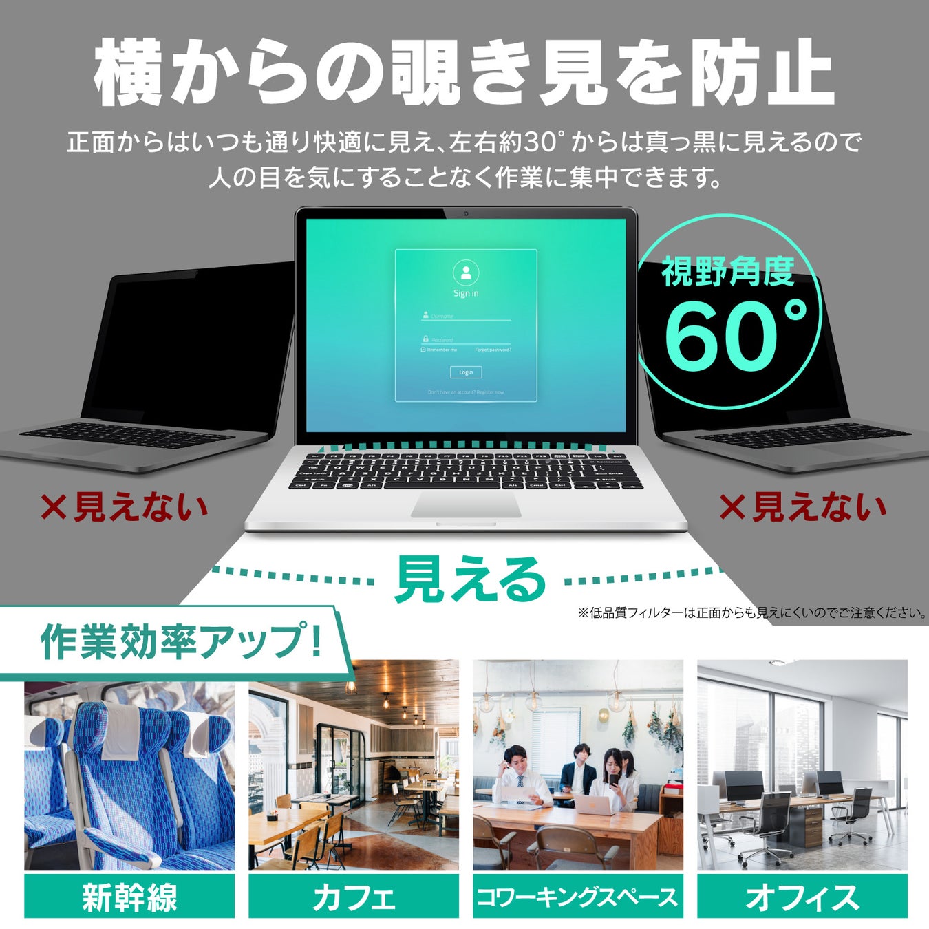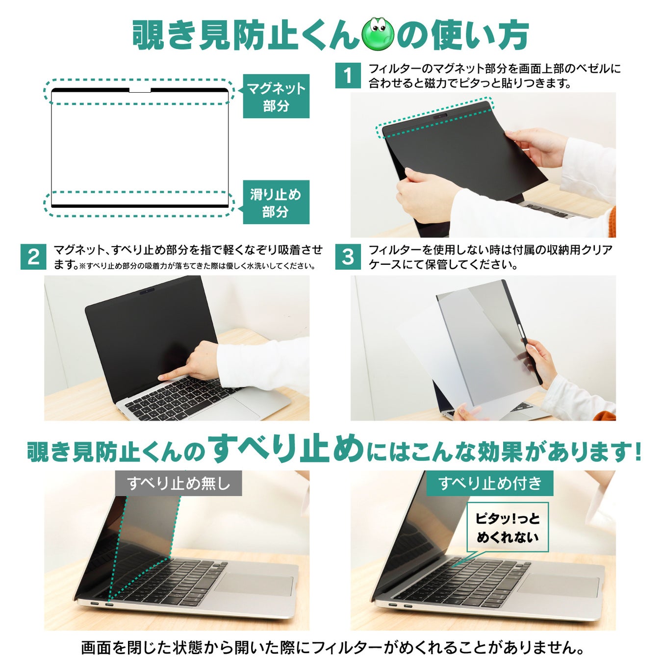 覗き見防止くんは従来のマグネット式プライバシーフィルターであった”開閉時のめくれ””磁石が弱いことによる貼り付けにくさ”などを改善したフィルムです。