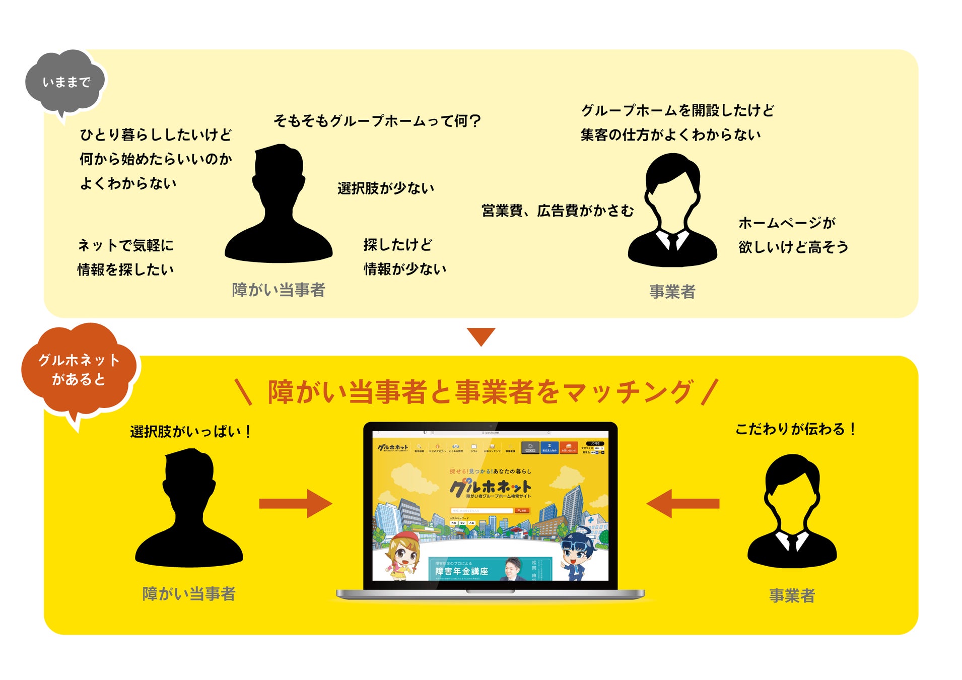 障がい者グループホームのみを検索できるポータルサイト「グルホネット」は、2022年4月にサイトをオープンしましたが、ポータルサイトとして物件検索ができることと、必要な情報を得られるだけでは、住まい探しをしている障がい者と、住まいを提供している障がい者グループホーム事業者のよりよい環境づくりには及ばないと考えました。