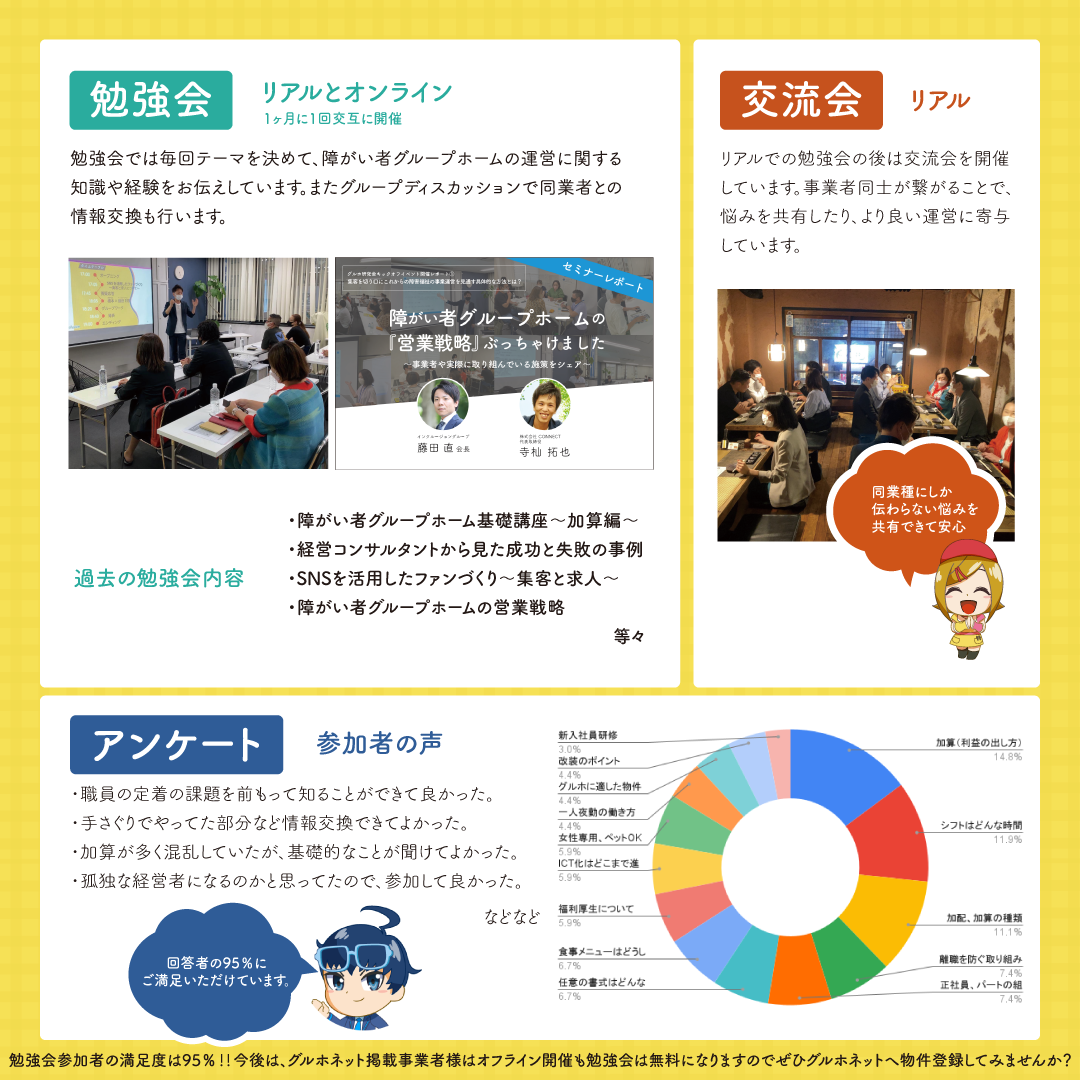 こういった活動を通して、障がい者グループホーム事業者が利用者獲得や事業運営に悩むことなく、利用者支援に注力できる環境をつくることで、事業者だけでなく利用者の利益につなげていくことを目的としています。