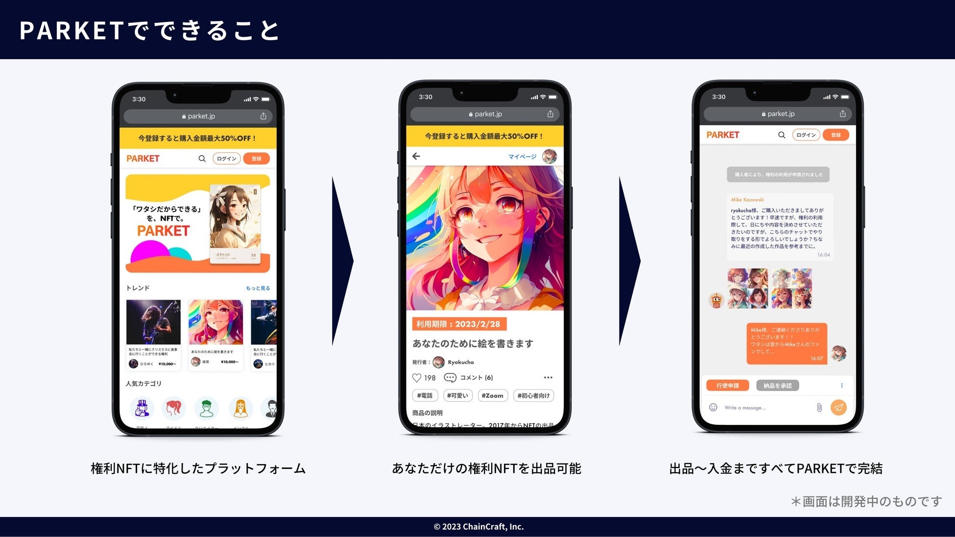 PARKETはNFTを個人のスキルや権利などに紐付けることに着目しており、誰もが簡単に、自分の”NFT権利”を発行し、サービス提供を行い、収益を上げられるプラットフォームです。個人の可能性をブロックチェーン・NFT技術を使って開花させることを狙っております。