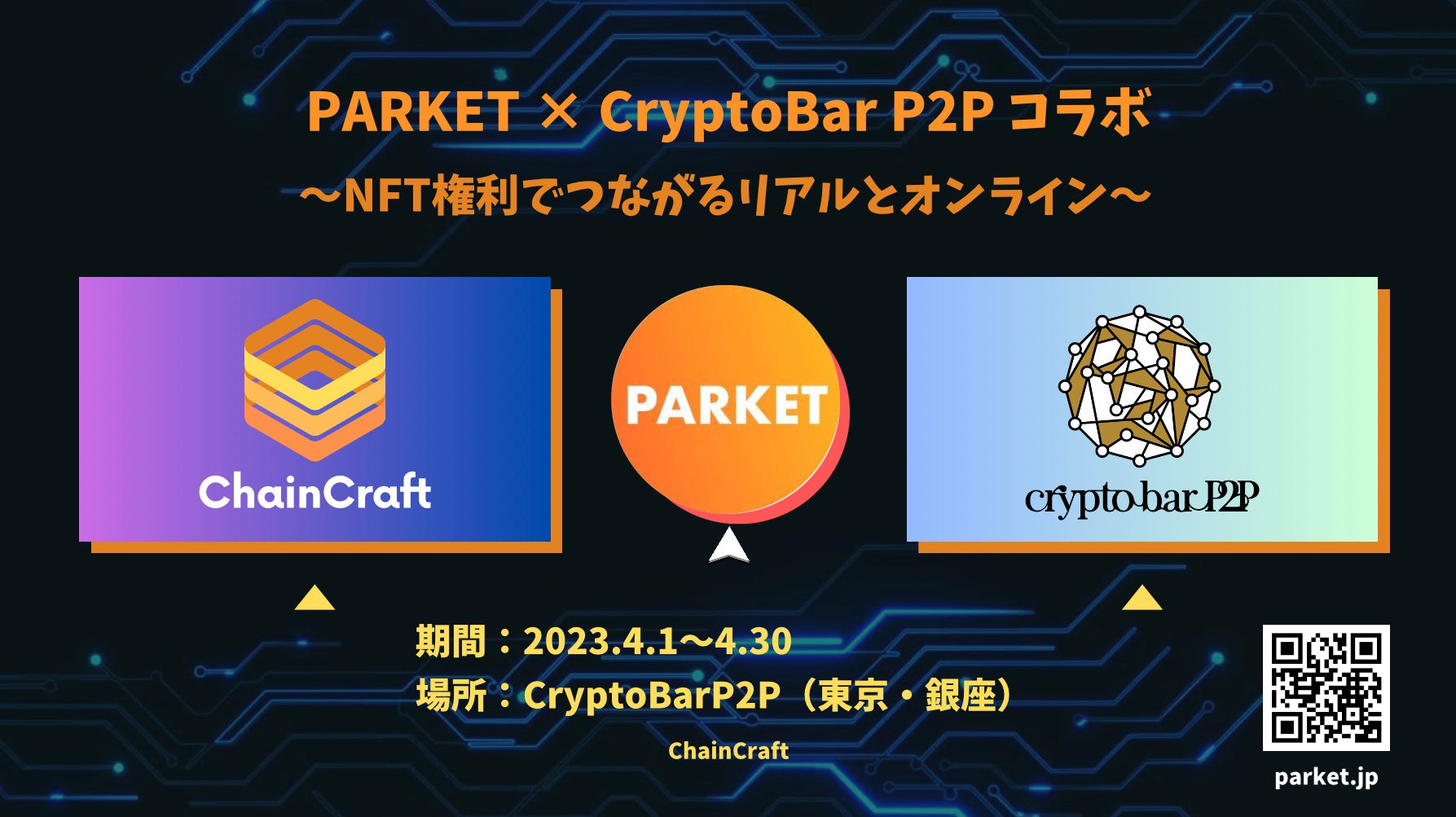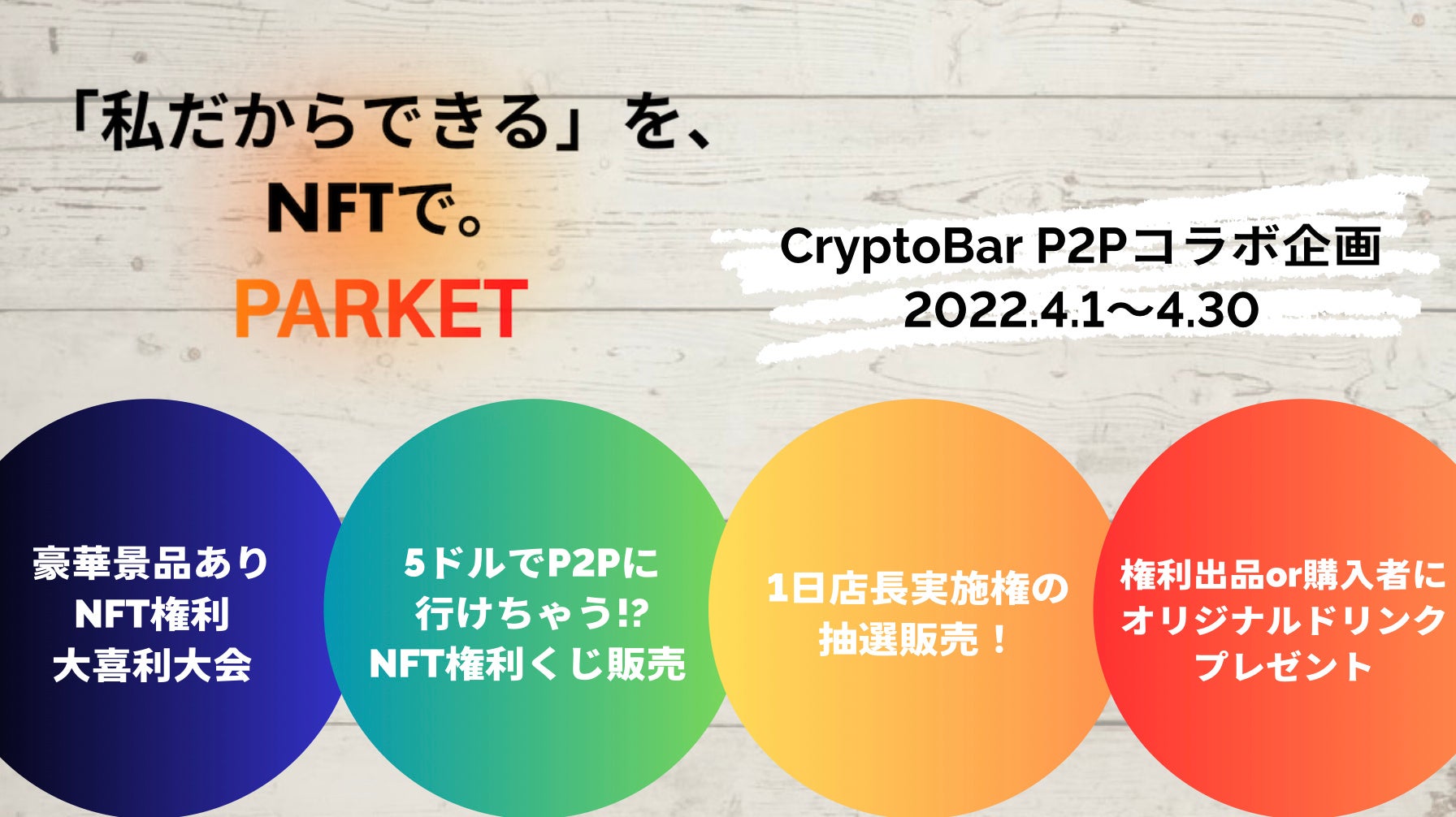 PARKETは個人の「私だからできる」を“NFT権利”として誰でも簡単に発行・流通させることができるNFT権利発行プラットフォームです。本コラボイベントでは、CryptoBar P2Pというリアル空間を活かした企画を多数実装します。来訪者の皆様には、PARKETのNFT権利をきっかけに交流を行ったり、リアル空間でNFT権利を絡めたコンテンツを楽しんでいただけます。