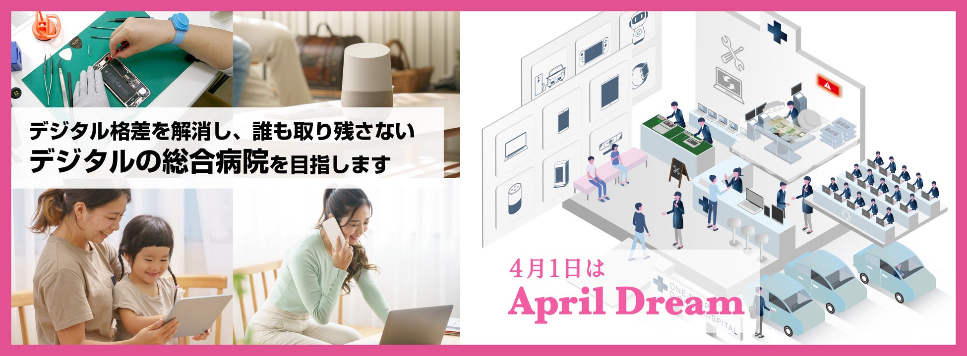 当社は、4月1日を夢を発信する日にしようとするApril Dreamに賛同しています。このプレスリリースは「日本PCサービスグループ」の夢です。デジタル機器の総合サポート行う日本PCサービス株式会社(本社:大阪府吹田市、代表取締役社長:家喜 信行、証券コード:6025、以下:当社)は、誰も取り残さないデジタル化の実現を支える”デジタルの総合病院“プロジェクトを始動し、2030年には社会のスタンダードとして誰もに認知されることを目指します。