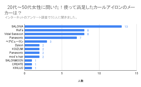 50人の女性にアンケートを行ったところ、コスパの良さで人気のメーカー「SALONIA」が13人と全体の26%で1番人気でした。