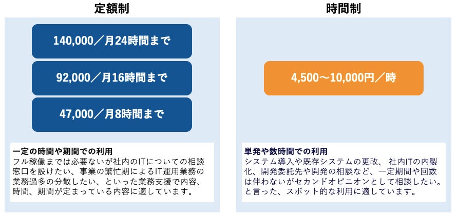 定額制の場合は最低契約期間は1ヶ月〜、時間制の場合は最低契約時間は1時間〜、必要な時に必要な期間でご契約頂けます。この他にも、ご相談の内容に応じた個別見積によるご提供も可能です。