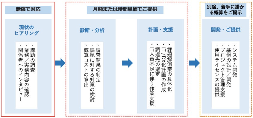 本サービスでは、お客様のITに関する課題のヒアリングから課題定義までを無償で対応し、課題解決のアプローチに対し、月額または時間単価による支援を行います。