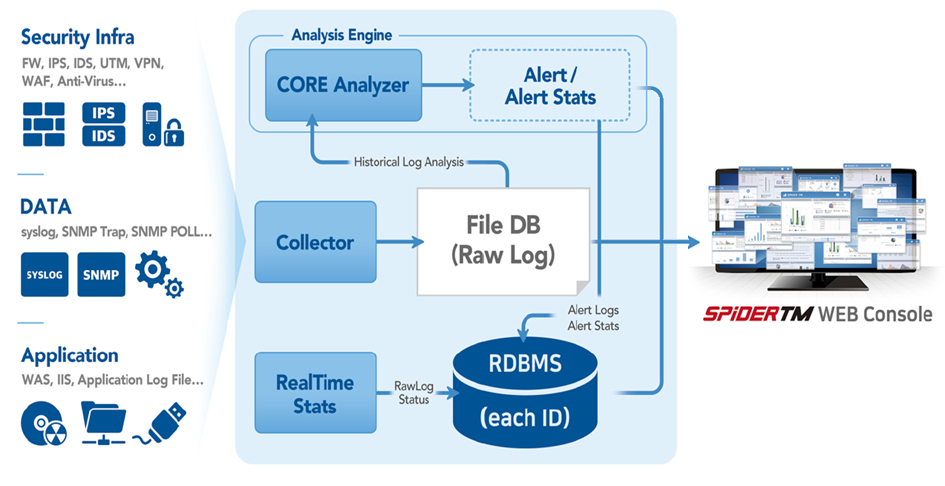 「SPiDER TM」ではログを外部に出力できる機能がある機器であれば様々なログを取り込むことが可能です。