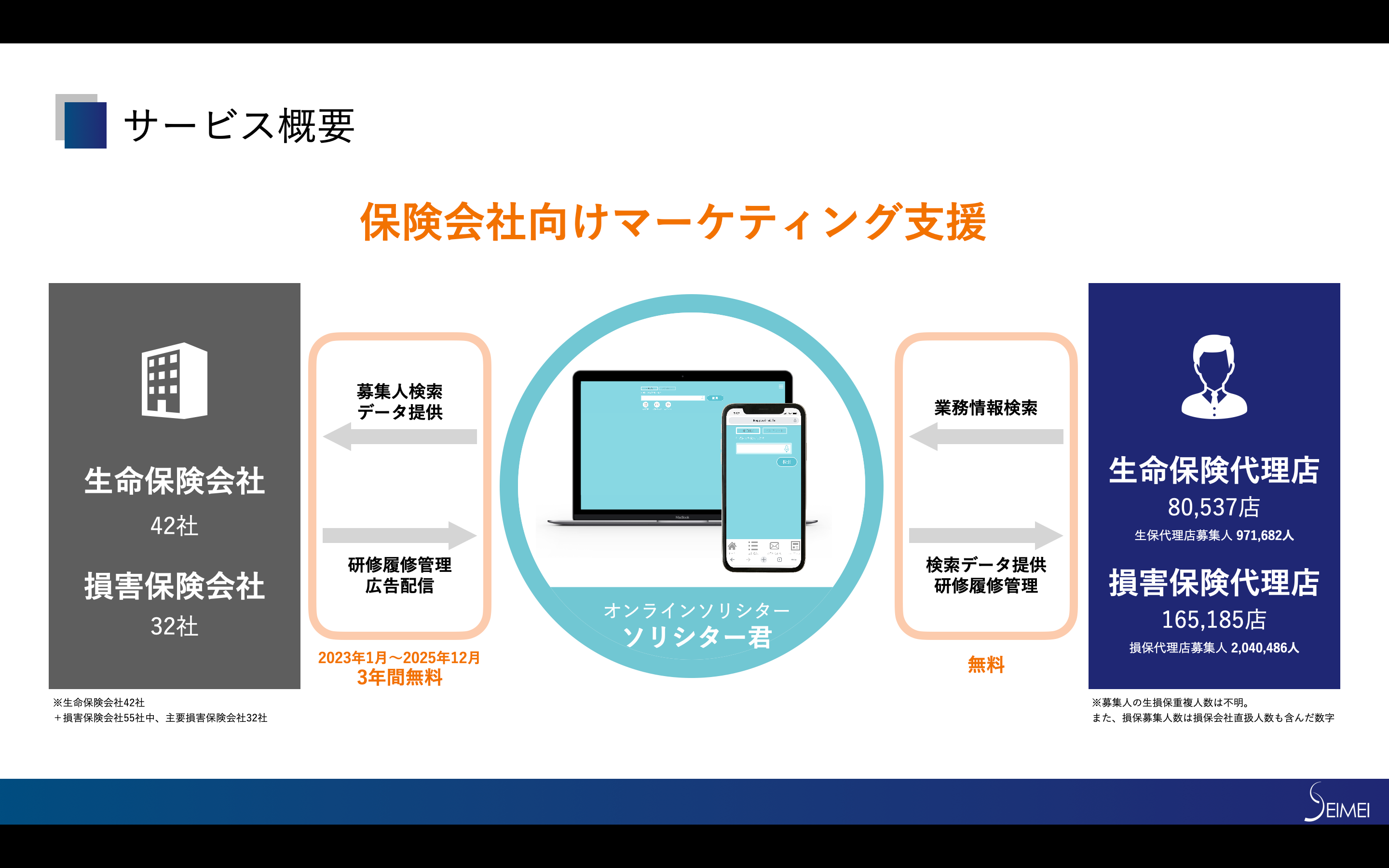 ※SEIMEI社がSOMとして定義する「保険プラットフォーム」事業ドメインは、以下の生命保険会社全42社及び主要損害保険会社32社が運営する業務領域及び、その保険商品を取り扱う保険代理店の業務領域の全てを指します。