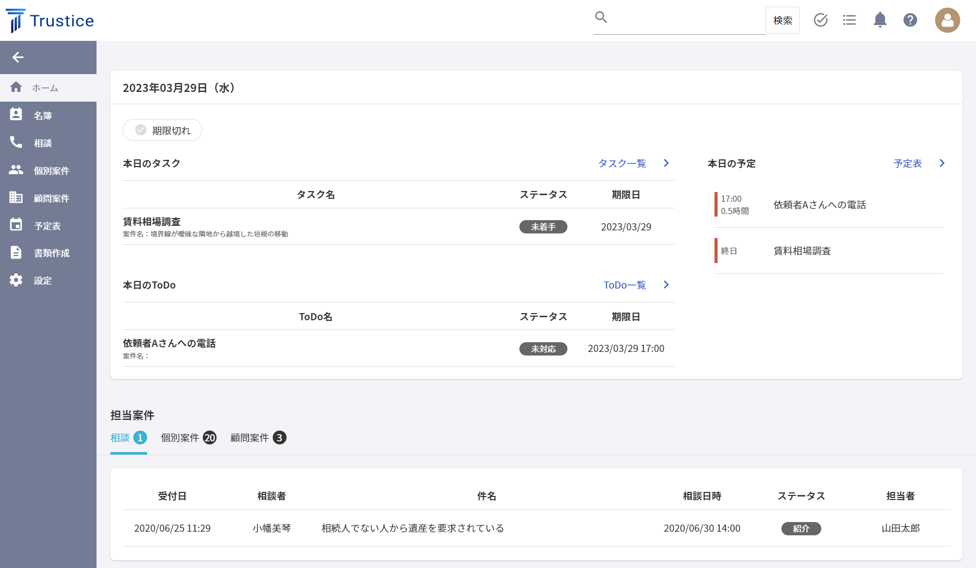 Trusticeは、依頼者からの相談、受任した案件、顧問先企業、案件処理に伴うタスク・予定などの管理ができる法律事務所向けクラウド型案件管理サービスです。