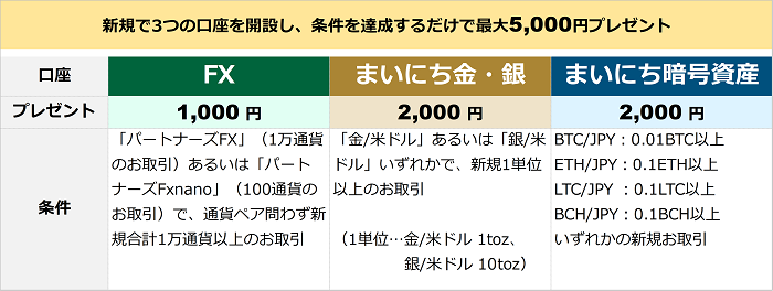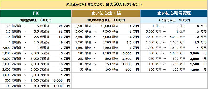 FX(パートナーズFX、パートナーズFXnano)、の新規注文の取引高に応じて最大30万円、まいにち金・銀、まいにち暗号資産の各新規お取引に応じてそれぞれ最大10万円、合計で最大50万円キャッシュバックいたします。
