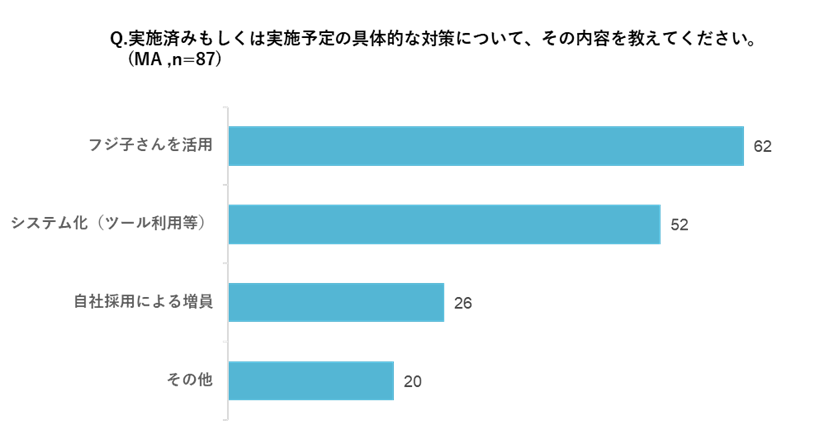 一方で、労働生産性改善における取り組みとして、実施済もしくは実施予定の具体的な対応策について確認したところ、「フジ子さんを活用」「システム化」の回答が多く、フジ子さんを使ってシステム化を実現し、労働生産性の改善に取り組んでいる、もしくは取り組み予定である状況も見受けられました。