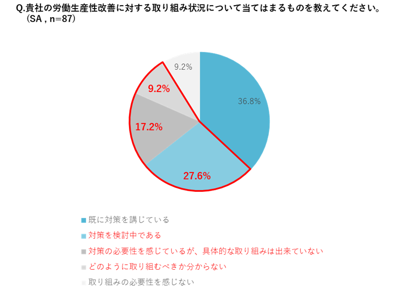 労働生産性改善に対する取り組み状況については、半数以上(54%)もの企業が実行に移せていないことが判明。前頁のアンケートからも、対策の必要性を感じながらも取り組みが出来ていない背景には、対策のための人材を確保・育成ができていない現状が見て取れます。
