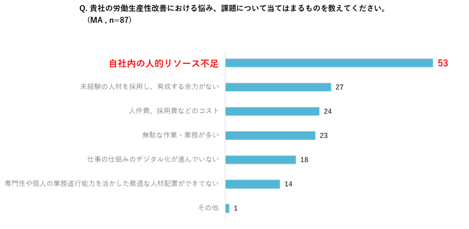 「改正労働基準法」を背景に、労働生産性改善における悩み、課題として、最も多くの企業が挙げたのは「自社内の人的リソース不足」。また、業務そのものの非効率や人材採用・教育に関連する事項を課題にあげる回答も多いことから、政府主導で推し進められるDXなどの取り組みも、リソース不足から“やりたいけど進まない”現状があることが見受けられます。