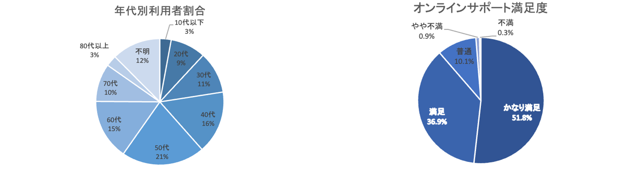 ご利用した市民の方からのアンケートを集計した結果は以下のとおりとなっており、延べ2,000名以上の幅広い年代の方にご利用いただき、85%以上の方が満足したと回答いただいています。またオンラインサポートによる混雑緩和やスムーズなご案内等の肯定的なご意見をいただいています。