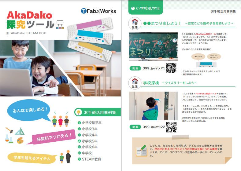 ティーファブワークスでは、プログラミングのスキルがこれからの先生・児童でも、主体的対話的深い学びにつなげながら、楽しく完成体験・成功体験が行える「製品開発チャレンジ https://399.jp/doc/guide.pdf 」授業の推進を行っております。