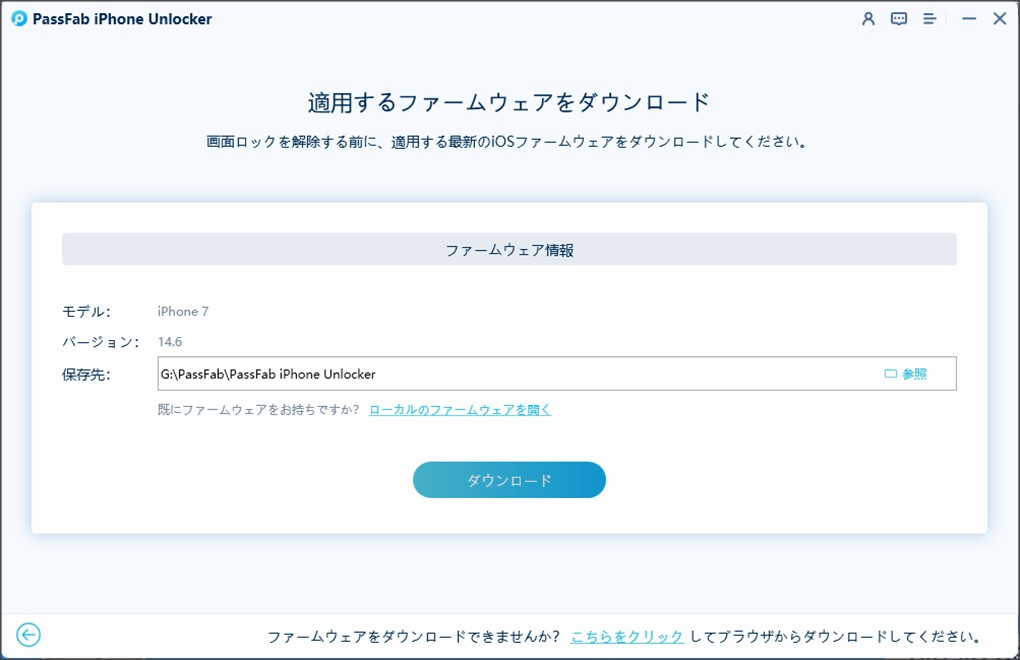 Step3:自動的に最新のiOSファームウェアが検出されますので保存先を指定した後、「ダウンロード」を押します。