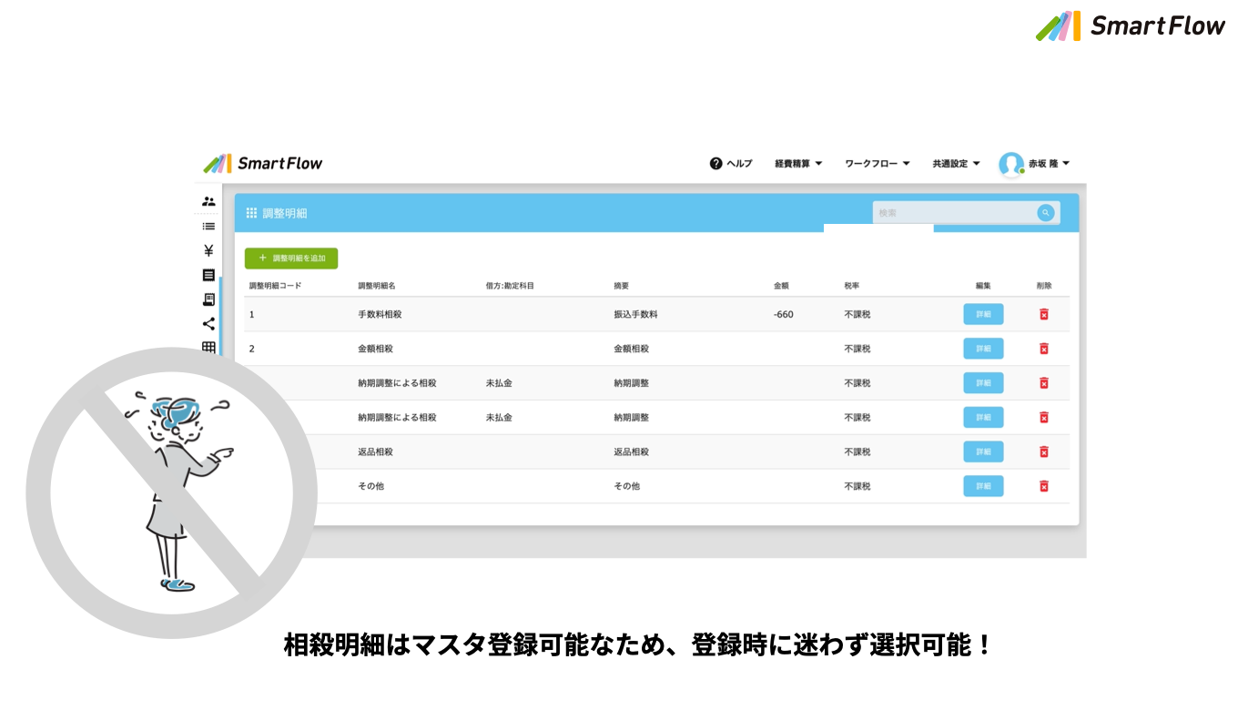 相殺を行うための調整明細は事前にマスタ登録が可能です。