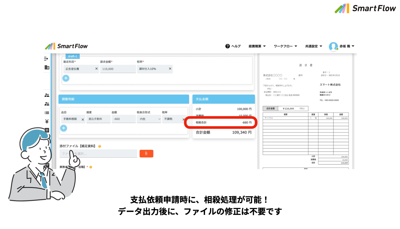 申請時に相殺処理が可能なため、SmartFlowからファイルを出力後、修正対応は不要です。