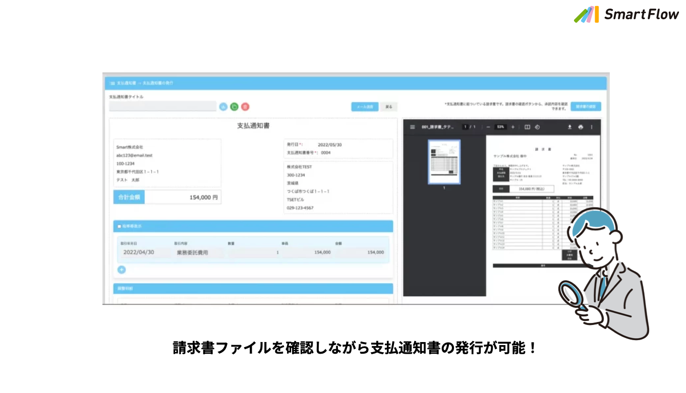 支払通知書発行画面では、実際の請求書ファイルを確認しながら入力可能です。