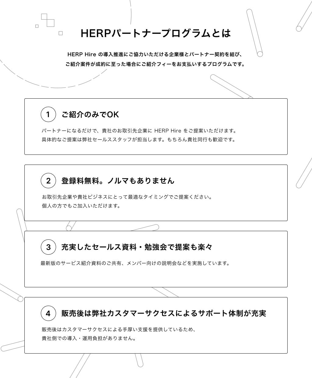 パートナーを通じて『HERP Hire』の紹介を受けた企業が契約に至った場合、パートナーおよび紹介先企業の双方に、プログラム限定の特典を提供いたします。(条件・特典の詳細は、特設サイトをご覧ください)