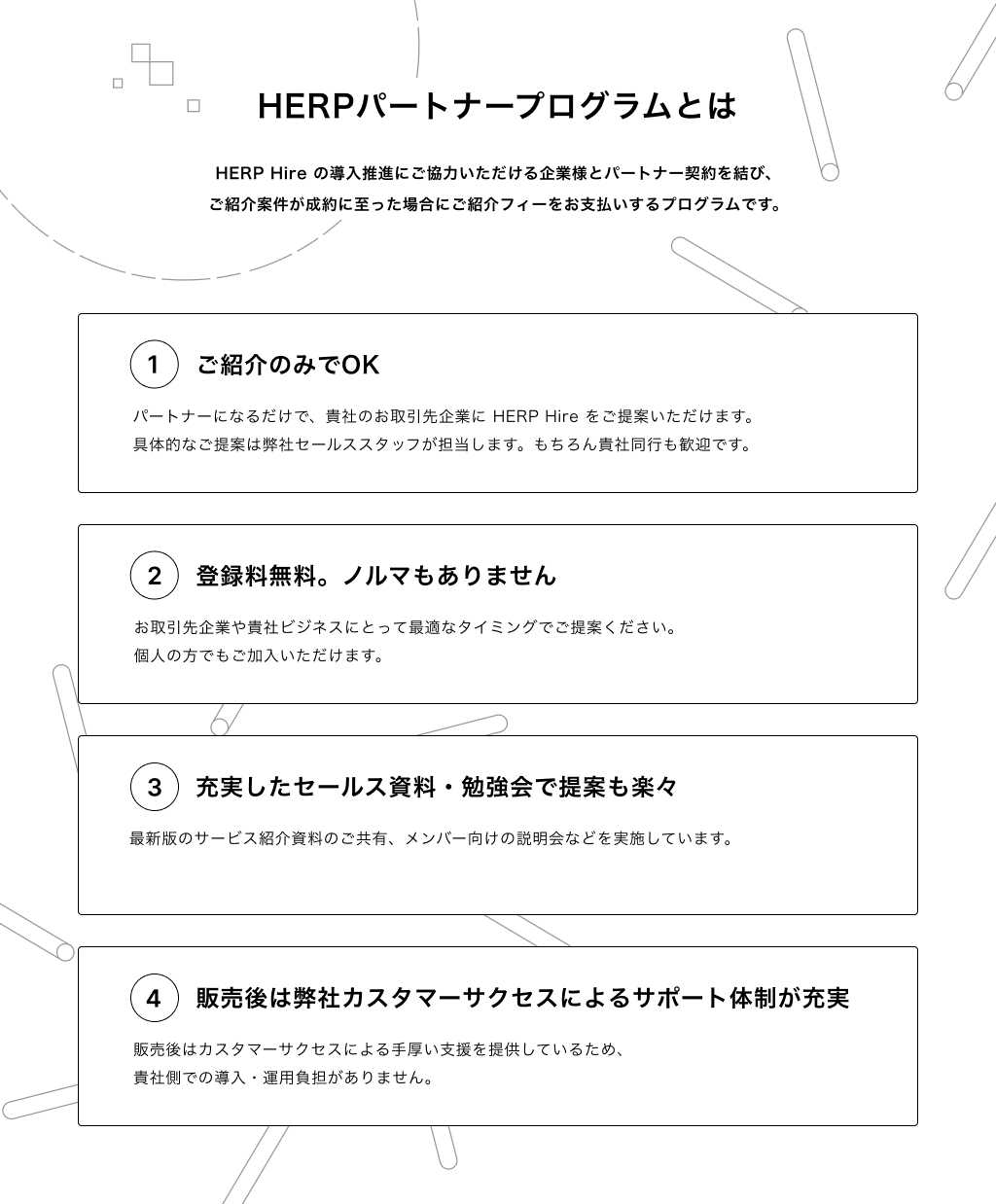 パートナーを通じて『HERP Hire』の紹介を受けた企業が契約に至った場合、パートナーおよび紹介先企業の双方に、プログラム限定の特典を提供いたします。(条件・特典の詳細は、特設サイトをご覧ください)