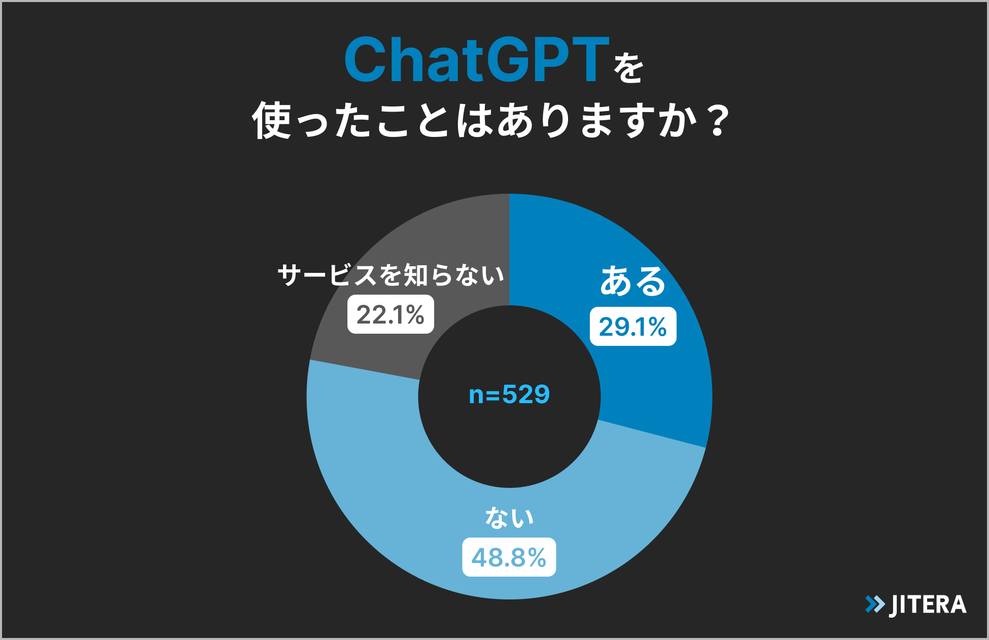 ChatGPTを利用したことがあるか尋ねたところ、約3割が「ある」と回答しました。また、2割超のエンジニアがChatGPTというサービスを知らないことがわかりました(n=529)。