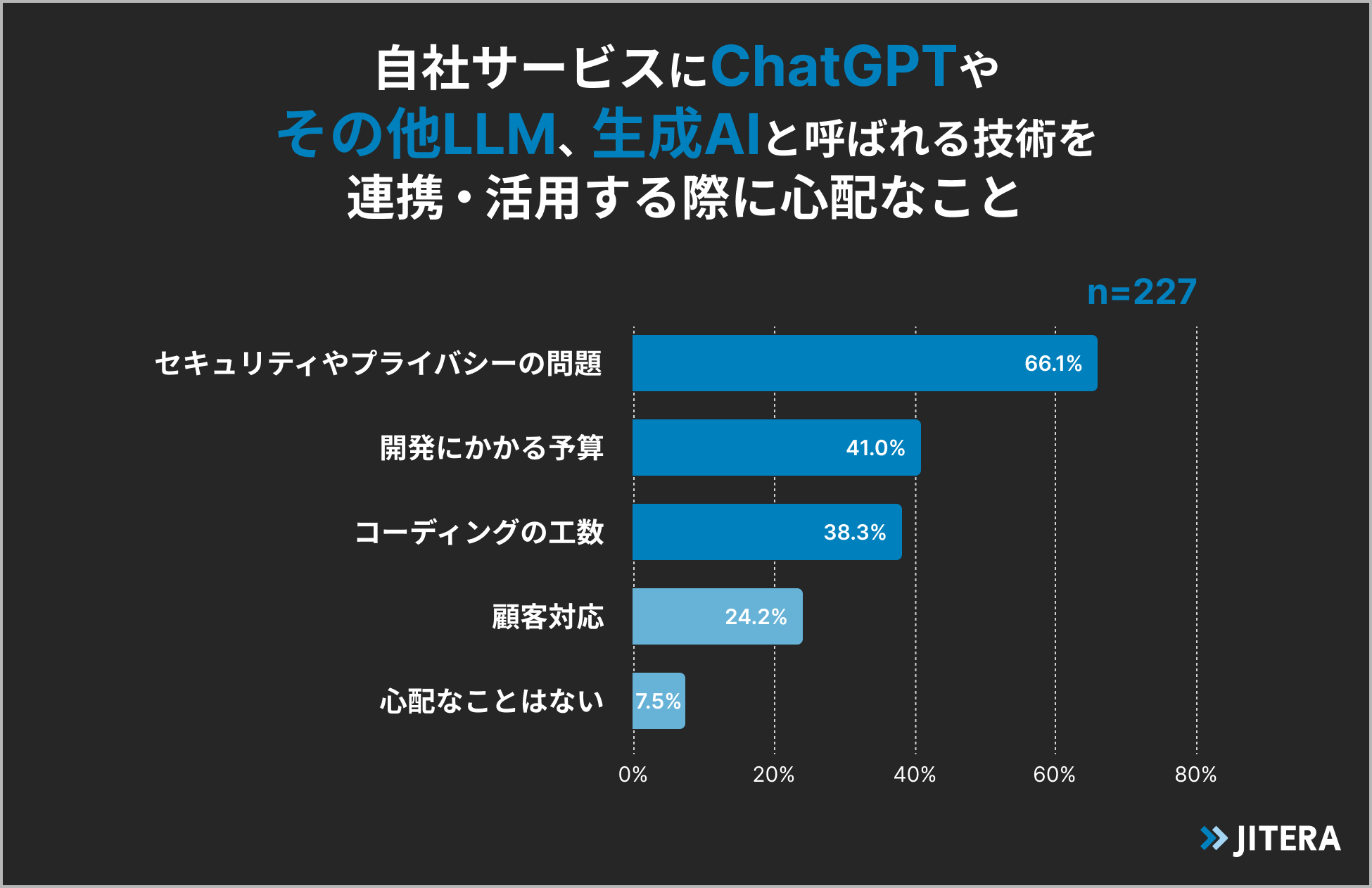 自社サービスにChatGPTやその他LLM、生成AIと呼ばれる技術を連携及び活用する際にどのようなことが心配か尋ねたところ、「セキュリティやプライバシーの問題」が66.1%で最も多く、「開発にかかる予算」が41.0%、「コーディングの工数」が38.3%と続きました(n=227 / 自社サービスとChatGPTを連携させたいエンジニア)。