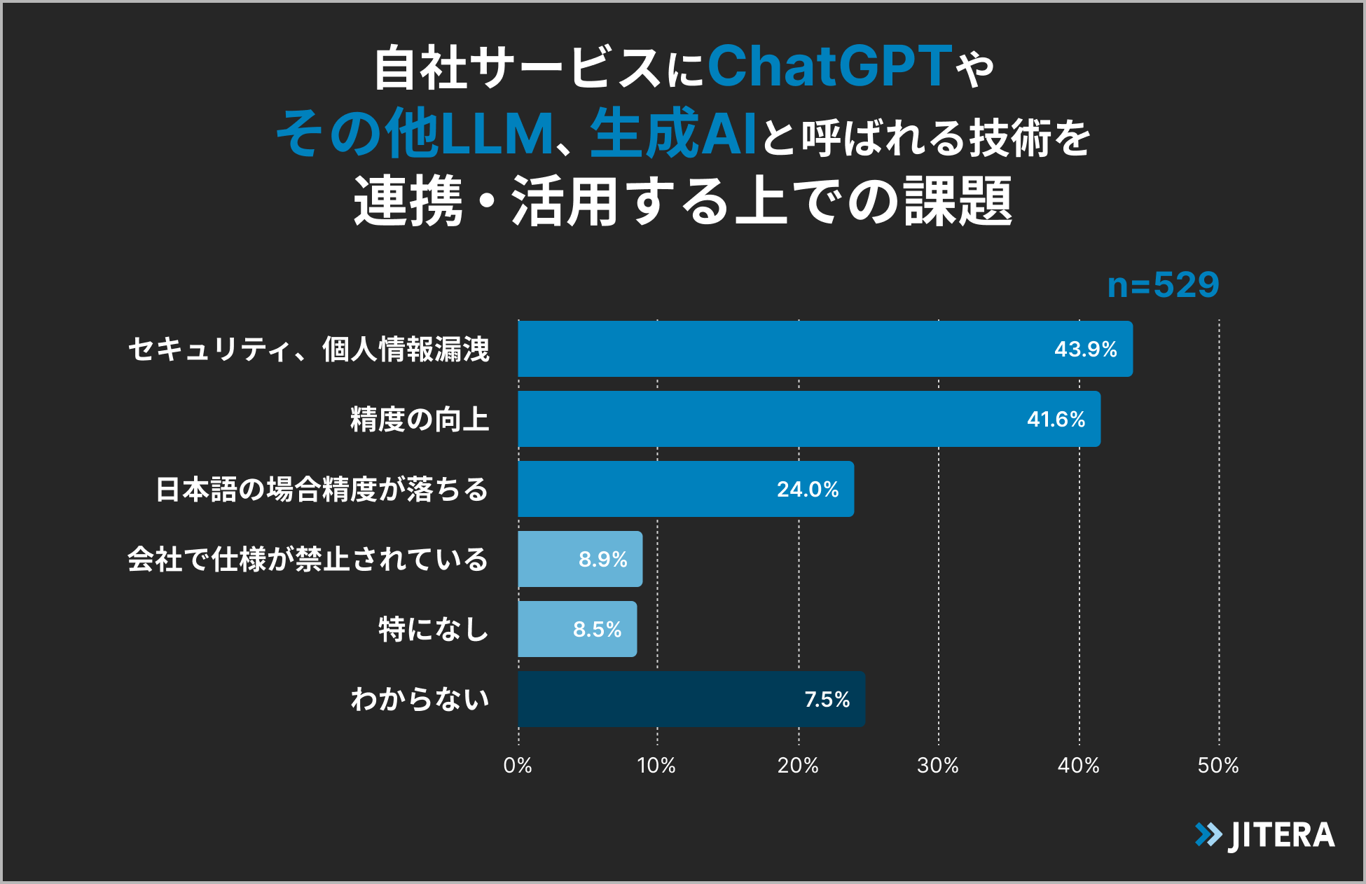 自社サービスにChatGPTやその他LLM、生成AIと呼ばれる技術を連携及び活用する際にどんな課題があるか尋ねたところ、「セキュリティ面」が43.9%で最も多く、「精度の向上」が41.6%と続きました(n=529)。