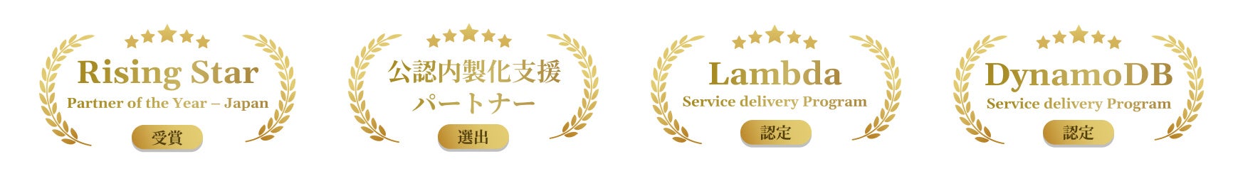 LambdaやDynamoDBのAWS サービスデリバリープログラムを取得し、2022年には「内製化支援推進 AWS パートナー」の選出、「Rising Star Partner of the Year – Japan」を受賞しました。
