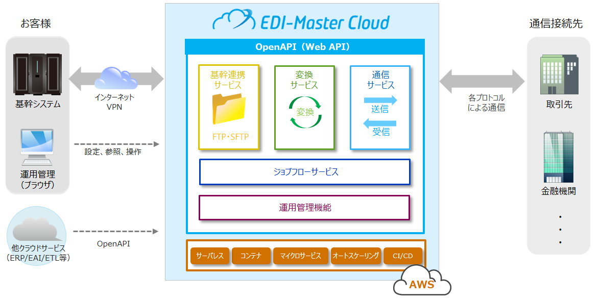 “EDI-Master Cloud”は、通信・変換・運用などのEDIとしての機能要件をクラウドネイティブな環境で実現することに加え、システム間連携機能、EDI業務運用サービスも提供します。