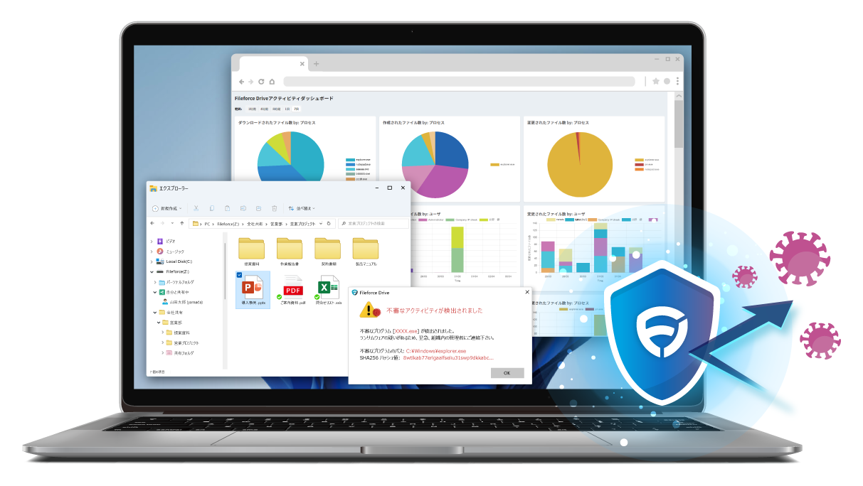 ランサムウェアの疑いがあるふるまい(プロセス)を検知し、プロセス単位でクラウドへのアクセスを遮断。即座に社内のすべてのFileforce Driveにも検知状況を伝播することでFileforceDriveにおけるランサムウェア被害の拡大を防ぎます。また、プロセス単位でのクラウドアクセスを遮断するため、ユーザーによる通常の業務は継続できる点も「業務を止めない」Fileforceの特長です。