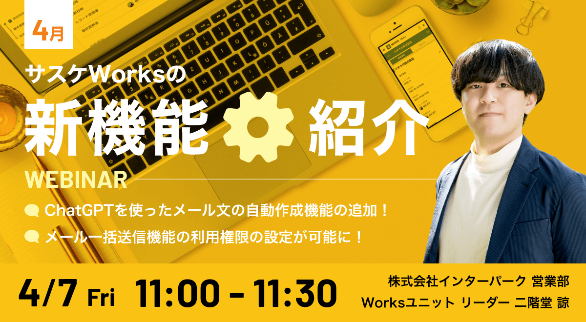 タイトル:サスケWorks新機能ウェビナー「Chat GPT連携 メール本文自動作成機能」他