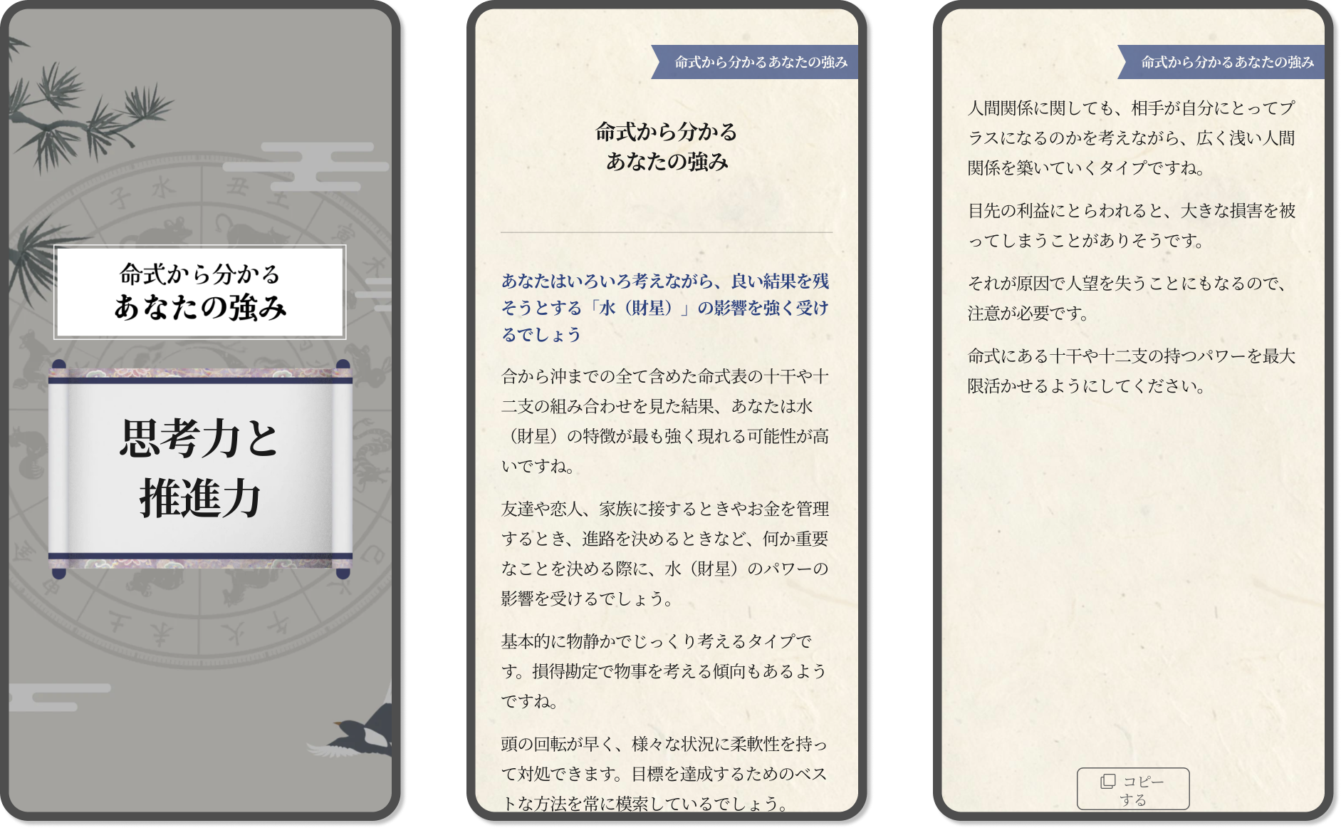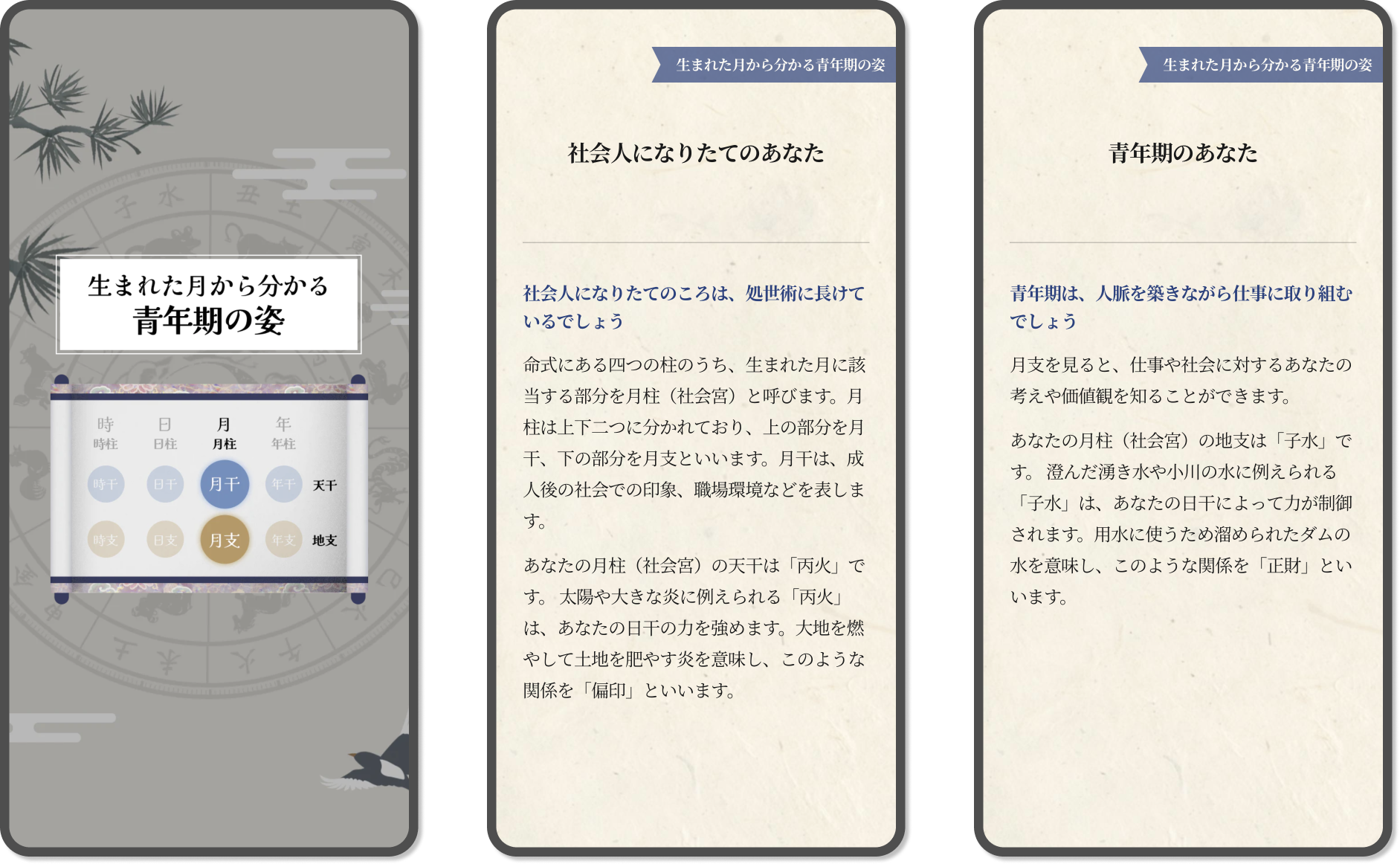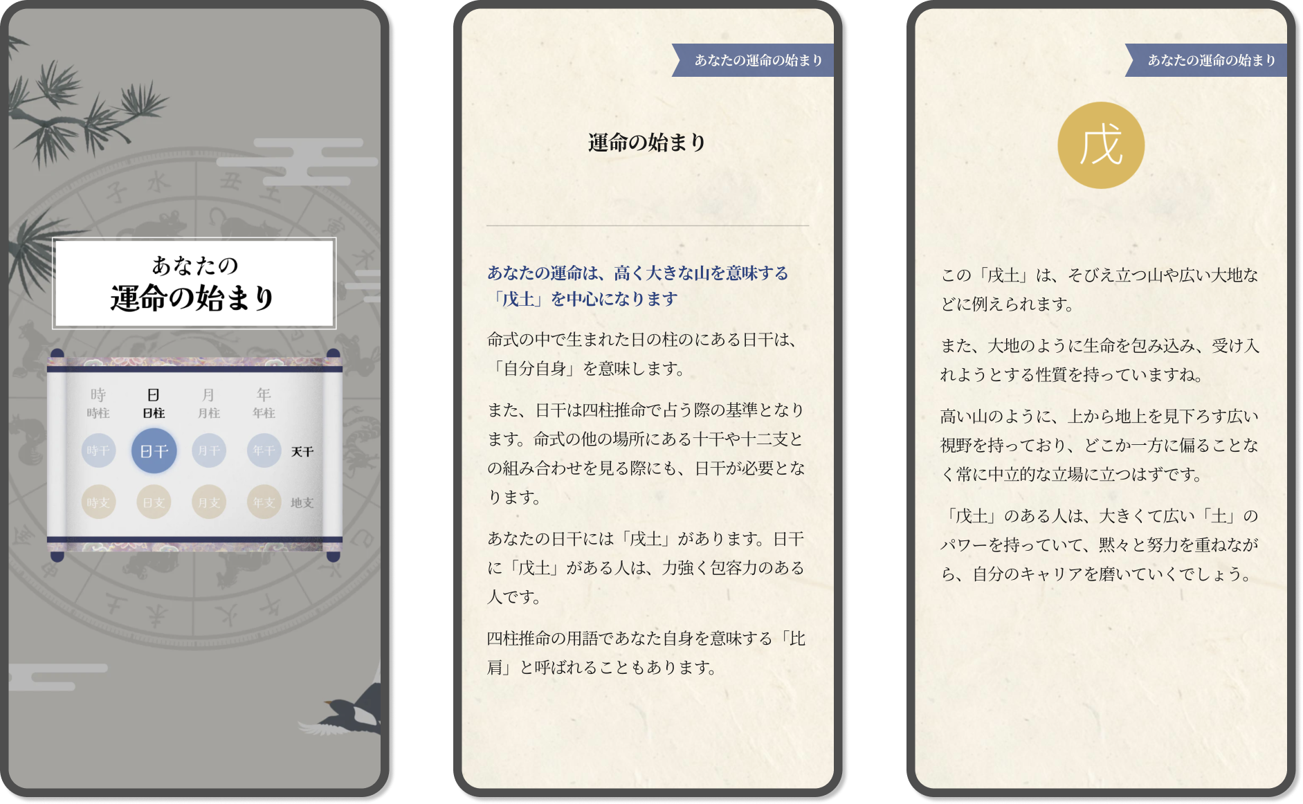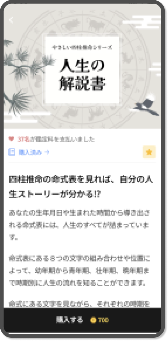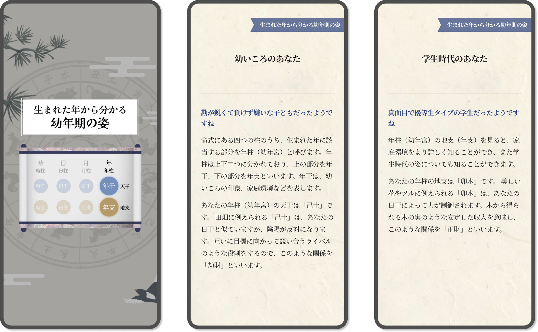 今回リリースされた「やさしい四柱推命シリーズ 人生の解説書」 では、四柱推命を用いて、自分の人生について占うことができます。