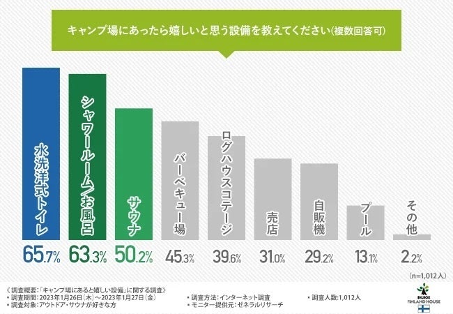 ログハウス専門メーカーのビックボックス(栃木県宇都宮市)が2023年2月に実施した調査によると、「キャンプ場にあったらうれしい設備とは?」の質問において、1位は「水洗洋式トイレ」(65.7%)でした。