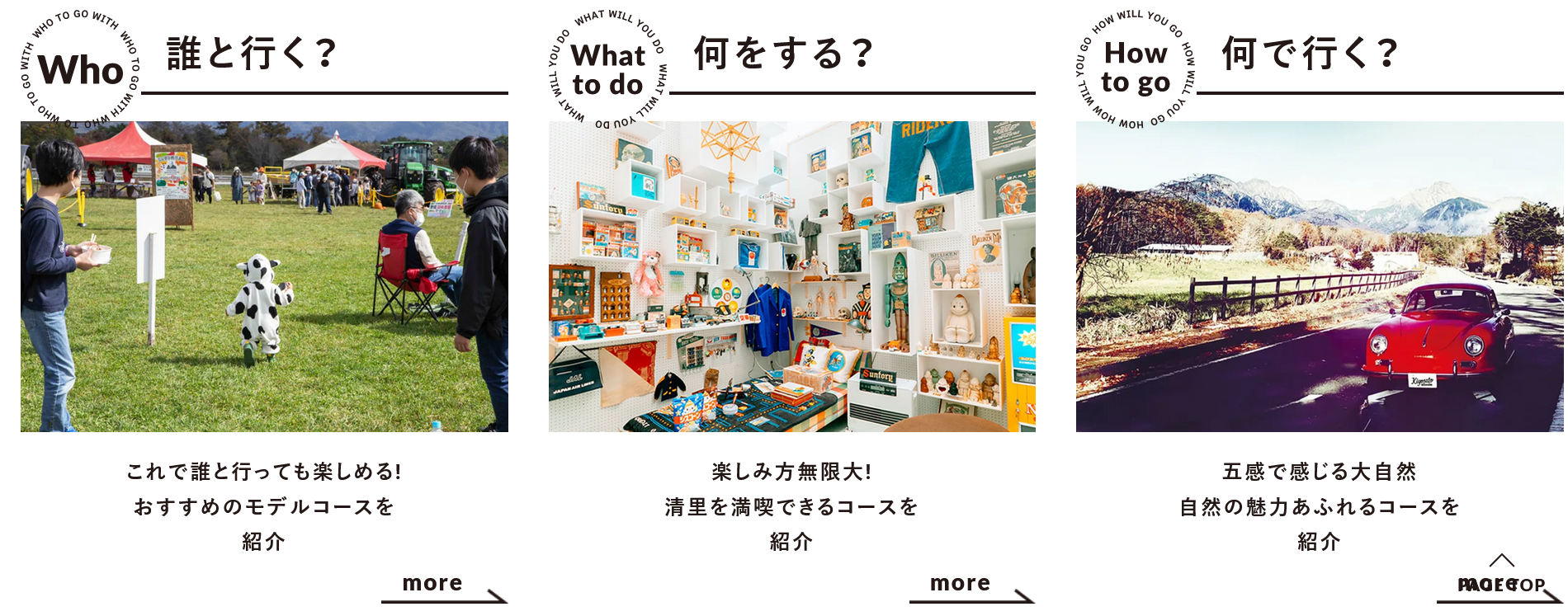 清里の観光、宿泊などのお役立ち情報だけではなく、清里をもっと楽しむ歴史や地元の方ならではの情報をブログで配信するなど充実のコンテンツをご用意。地域と二人三脚で始める地域創生の新しい在り方を構築し、清里のブランド価値をそのままにクリエイティブの力で新しい体験価値を創造していきます。