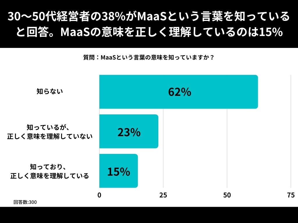 30代〜50代の男女を対象とした「MaaSという言葉の意味を知っていますか?」というアンケートで最も多かった回答は「知らない」で62%でした。