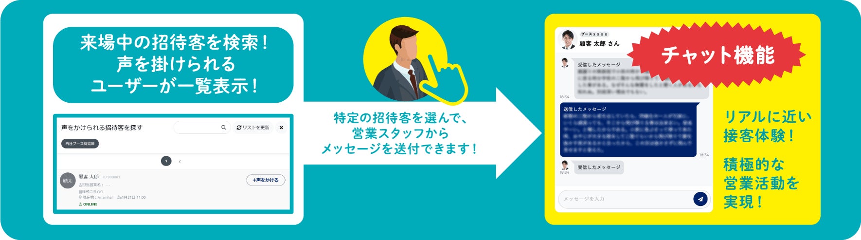 「チャット機能」「チャットお声がけ機能」「会場アナウンススケジューラー」「LIVE配信スケジューラー」等の多彩なプッシュ機能で、来訪者とリアルタイムにコミュニケーションを取ることが可能。従来の単調なデジタルマーケティング施策とは一線を画す、「デジタル体験の場」を創出することができます。