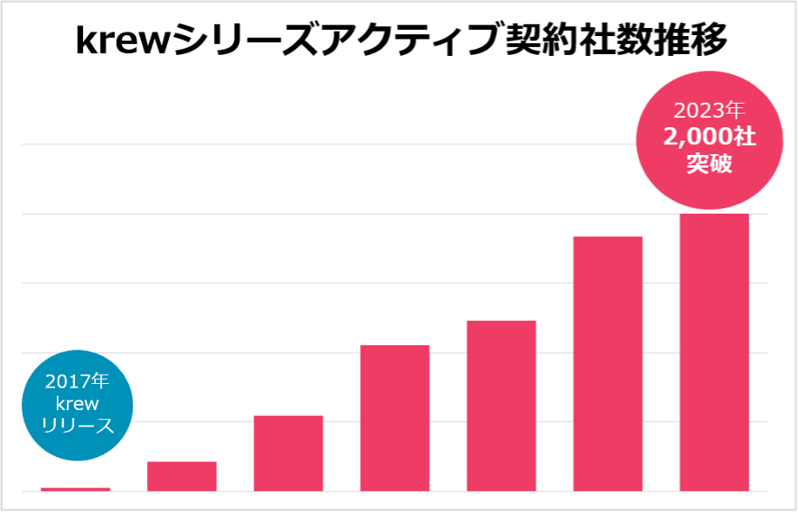 krewは、kintoneによる脱Excelを可能にするプラグインです。2017年12月にリリースした「krewSheet」を皮切りに「krewData」「krewDashboard」の3つの製品を提供してきました。おかげさまで発売から5年を迎え、契約社数2,000社を突破することができました。