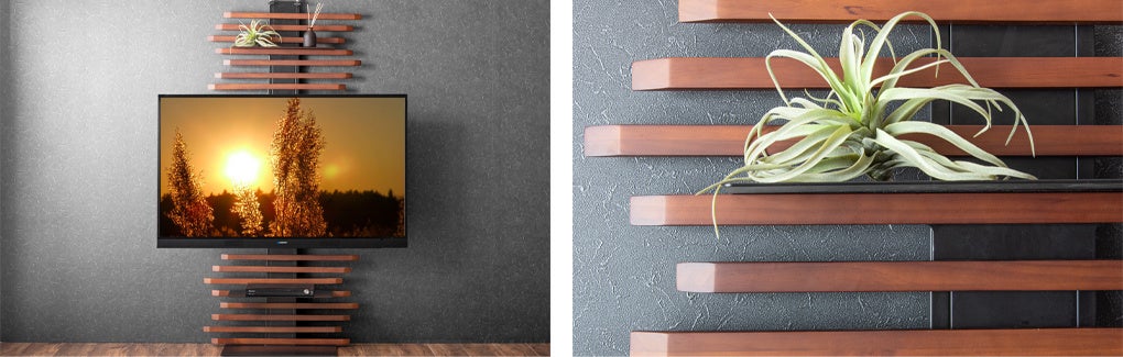 今回発売した4モデルはどれも65~90インチのサイズに対応しており、ローボードを使った設置に比べ大幅に床の設置スペースを削減ができるうえに、お部屋をスッキリと見せることができます。4モデルとも、機能性/デザイン性のある製品のため、より快適に、よりスタイリッシュに大型テレビをお楽しみいただけます。