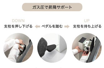 昇降方法は支柱根元のペダルを踏み、支柱を押し下げるか持ち上げて調節するという簡単な操作になります。いつもテレビを見る場所だけでなく、床座りやローソファなどの低めの位置や、食卓に合わせた高めの位置など、リビングからダイニングまで幅広いシーンに対応します。