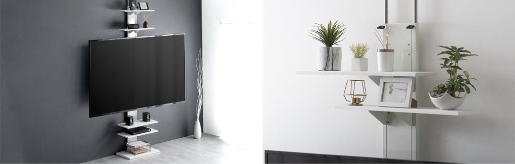 本製品は床と天井を天井までテレビスタンドの支柱を伸ばし固定する「つっぱり式」にすることで、テレビ上部のデッドスペースを壁面ディスプレイとして有効活用することができるようになりました。それぞれの棚板は自由に組み換えることができ、置くものや好みに合わせて壁面ディスプレイをお楽しみいただけます。また上下の角度調節機能/5段階の高さ調節機能を備えているので設置する場所や視聴環境に合わせて見やすくテレビを取り付けられます。