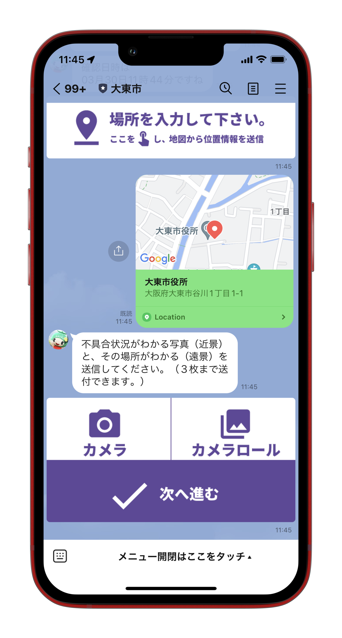 - 位置情報や破損個所の写真を送信し、状況など詳しい情報をトークに送信してください。確認画面が表示されるので、「通報する」ボタンをタップすれば完了です。